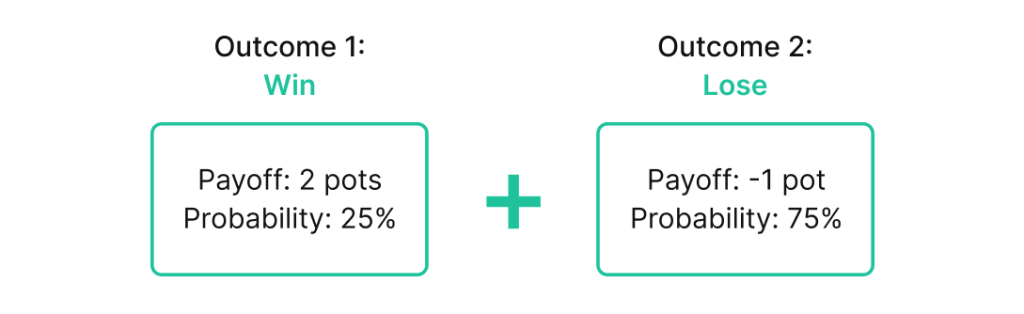 让我们从一个简单的例子开始。假设您面对一个全下,其金额等于当前底池大小,您有一个25%胜率的听牌。如果您跟注,有两种可能的结果:赢或输(不包括平局)。如果您赢了,您将赢得底池和对手的下注。如果您输了,您将损失一个底池大小的下注…