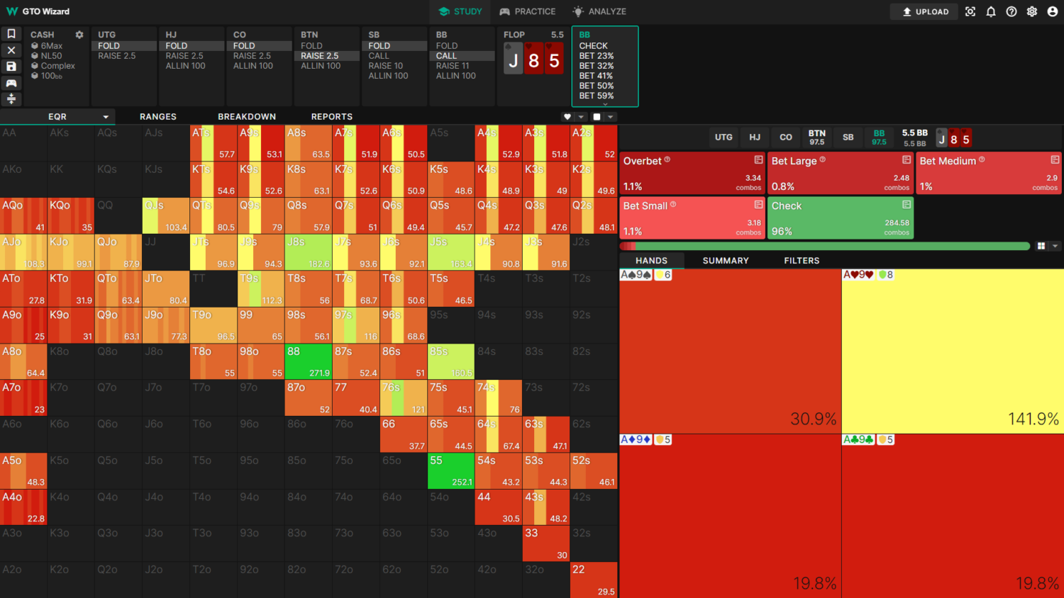 通过检查这些分布,我们可以一眼看出BTN在整个分布中具有轻微的范围优势,这主要归因于BB范围底部存在过多的垃圾牌。